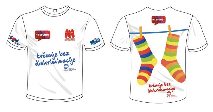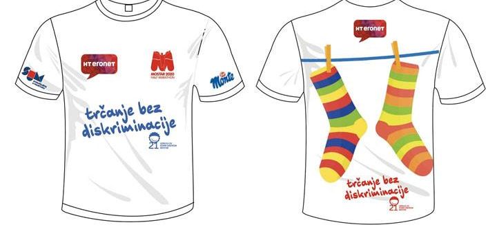 Dry FIT majica za sve natjecatelje HT Eronet Humanitarne utrke 4K. Zaštitni znak ove majice su šarene čarape kao međunarodni simbol osoba s Down sindromom.